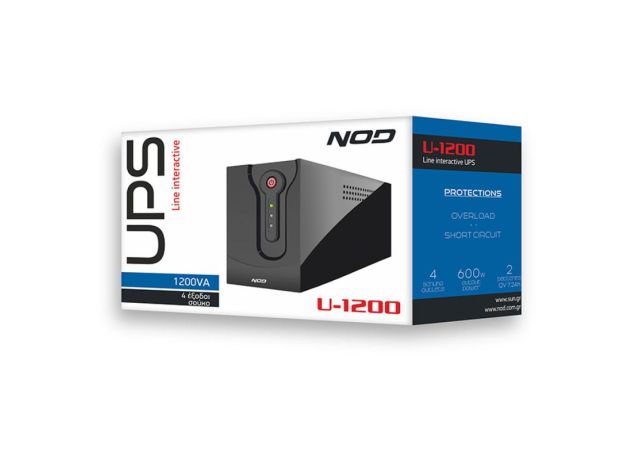 Το UPS NOD διαθέτει ισχύ 1200VA (600W) είναι εξοπλισμένο με 2 μπαταρίες NOD LAB 12V 7.2AH, 4 πρίζες σούκο και διαθέτει ενδεικτικές λυχνίες λειτουργίας και χαμηλής μπαταρίας LED. Επίσης διαθέτει ηχητική ειδοποίηση σε περίπτωση χαμηλής μπαταρίας.