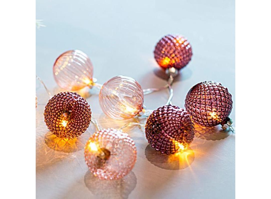 ΣΕΙΡΑ, 10 LED 5mm, ΡΟΖ ΓΥΑΛΙΝΕΣ ΜΠΑΛΕΣ 6cm, ΜΠΑΤΑΡΙΑΣ 3xAA, ΔΙΑΦΑΝΟ PVC ΚΑΛΩΔΙΟ, ΘΕΡΜΟ ΛΕΥΚΟ LED ΑΝΑ 15cm, ΠΡΟΕΚΤΑΣΗ ΠΑΡΟΧΗΣ 50cm, IP20