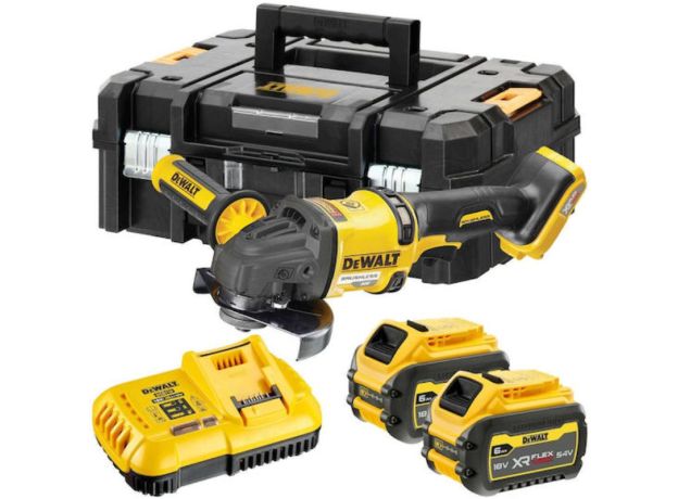 Γωνιακός τροχός της εταιρείας Dewalt μπαταρίας λιθίου 54V. Δέχεται δίσκους με διάμετρο έως και 125mm, έτσι καλύπτει ικανοποιητικά τις περισσότερες ερασιτεχνικές και επαγγελματικές εργασίες καθώς μπορεί να κόψει σε βάθος έως 4 εκατοστά.